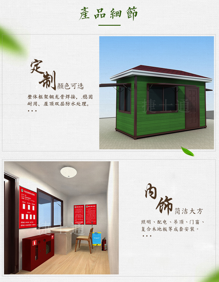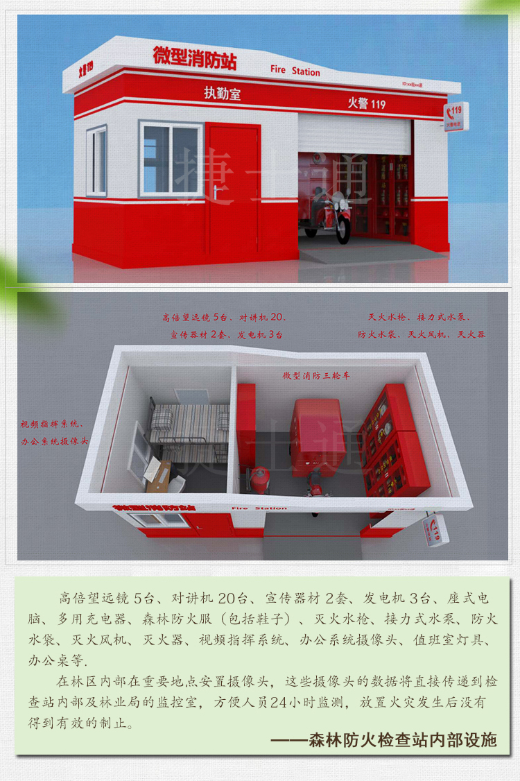 檢查站的工作人員要嚴格對進入林區(qū)的人員、機動車實施檢查和教育,扣留火種并對人員、車輛做好登記。 為了加強森林防火檢查站的管理,充分發(fā)揮防火檢查站的職能,每個地區(qū)的林業(yè)站、林業(yè)局都應該設立相應的森林防火檢查站,與山林的重要路口處。 森林防火檢查站內部設施:高倍望遠鏡 5臺、對講機 20、宣傳器材 2套、發(fā)電機 3臺、座式電腦、多用充電器、森林防火服(包括鞋子)、滅火水槍、接力式水泵、防火水袋、滅火風機、滅火器、視頻指揮系統(tǒng)、辦公系統(tǒng)攝像頭、值班室燈具、辦公桌等. 在林區(qū)內部在重要地點安置攝像頭,這些攝像頭的數據將直接傳遞到檢查站內部及林業(yè)局的監(jiān)控室,方便人員24小時監(jiān)測,放置火災發(fā)生后沒有得到有效的制止。 天津市捷士通科技有限公司10幾年來一直致力于戶外移動房屋的研發(fā)和生產,在森林防火檢查站上面有一套成熟的方案,也為首都北京的森林防火工作出過應有的力量。 天津市捷士通科技有限公司,有專業(yè)的移動房屋生產線,可以在短時間內大量生產客戶需要的產品,有專業(yè)的研發(fā)團隊,針對客戶的需求做到配比度極高??梢园l(fā)全國,全國均有合作的物流公司。